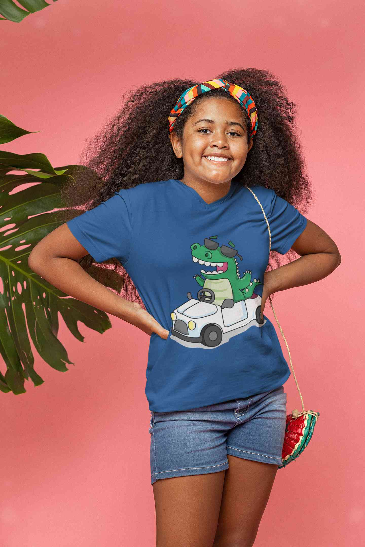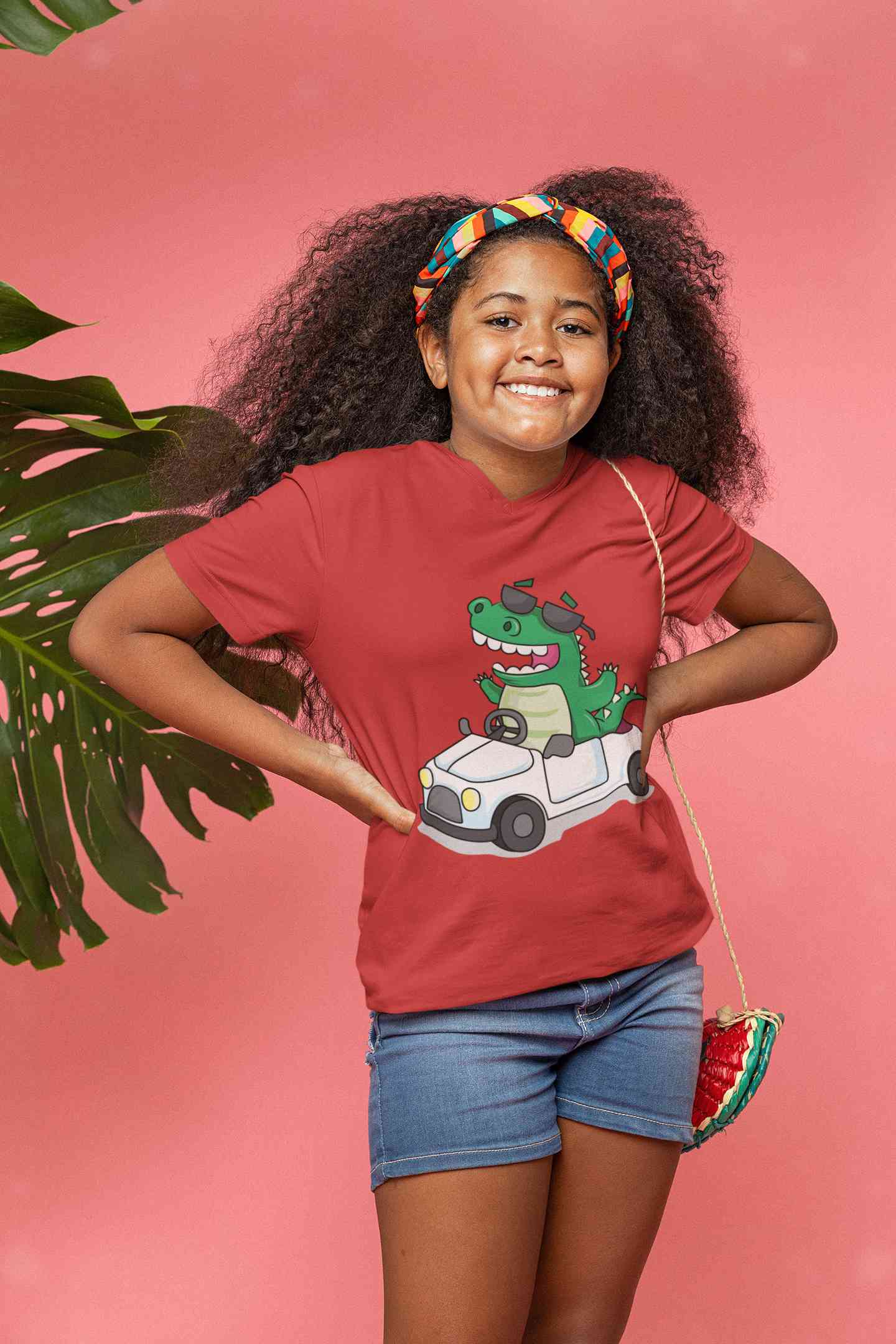 Dino Car Cartoon Half Sleeves T-Shirt For Girls -FashionRazor