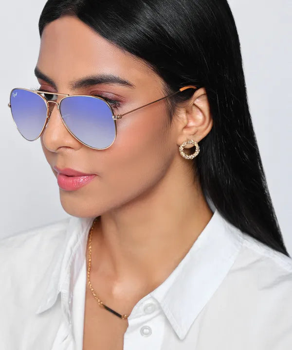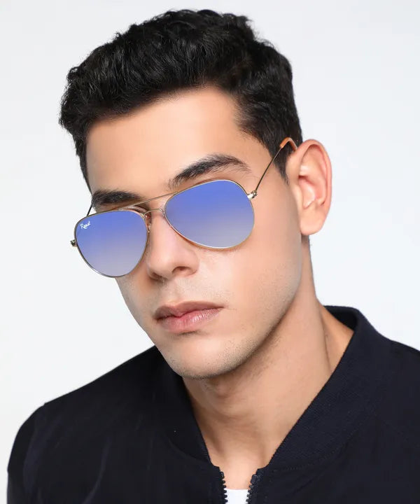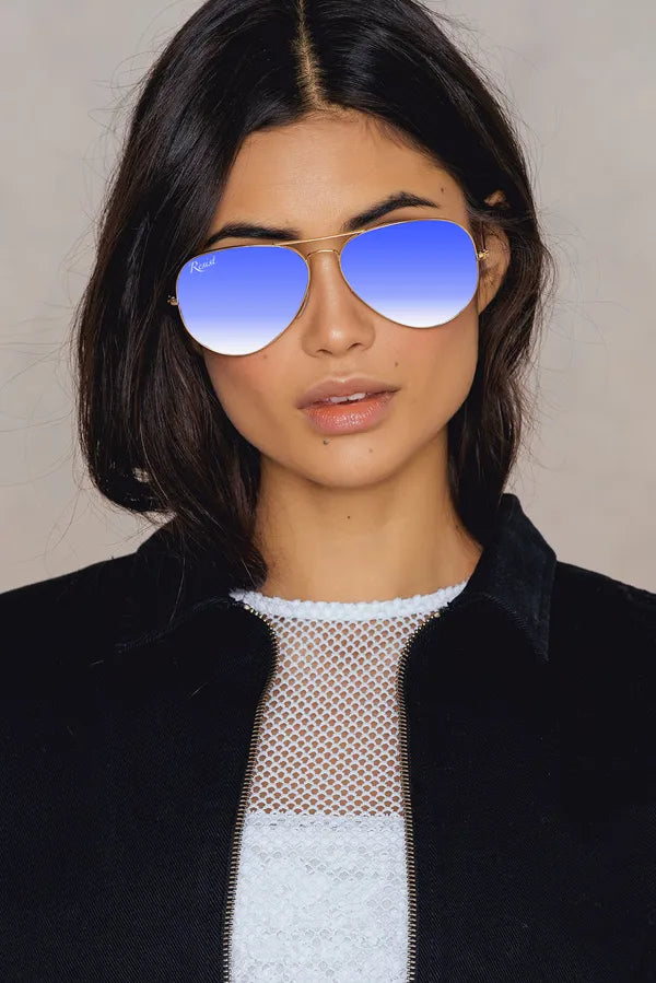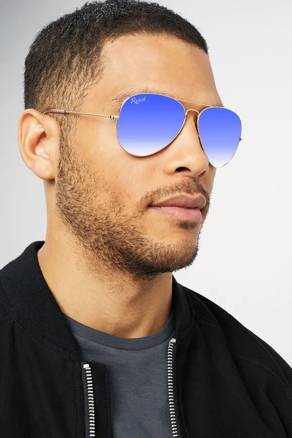 Resist Eyewear’s Gold Blue Reflector Gradient Aviator Sunglasses offer both style and substance. Crafted for those who seek clarity, comfort, and standout design, these aviators elevate your look while providing essential eye protection in any light.