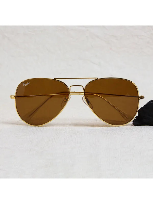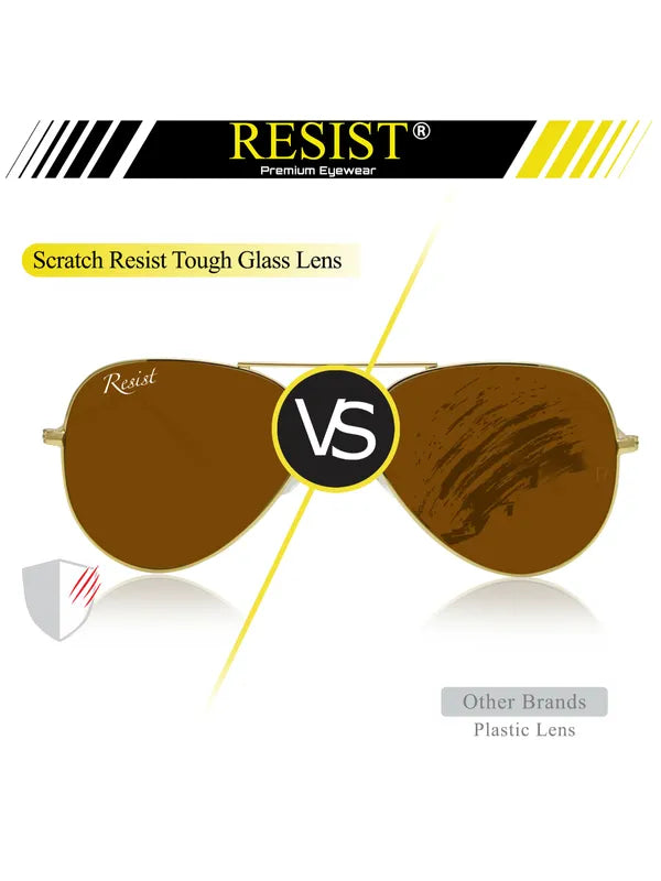 Elevate your look with the timeless appeal of the UV-Protected Gold Brown Aviator Sunglasses by Resist Eyewear. Crafted with high-quality glass lenses, these aviators provide superior clarity, scratch resistance, and easy maintenance. The multi-layer anti-reflective coating enhances vision by reducing glare, while the sturdy gold metal frame ensures a comfortable and stable fit for all-day wear. These versatile sunglasses, designed for both men and women, offer 100% protection against harmful UVA and UVB rays, making them perfect for both formal occasions and adventurous outdoor activities like hiking, fishing, and boating. Enjoy style, comfort, and peace of mind in any environment.
