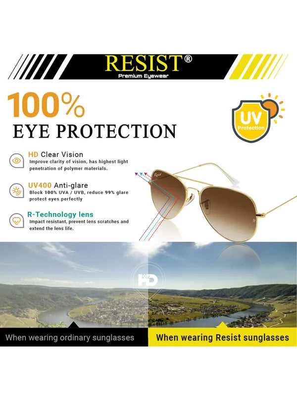 Discover the perfect blend of timeless design and cutting-edge protection with Resist Eyewear’s UV-Protected Gold Brown Gradient Aviator Sunglasses. Crafted for both men and women, these aviators feature premium glass lenses that offer exceptional clarity, scratch resistance, and easy maintenance. The stylish brown gradient lenses reduce glare with a multi-layer reflection coating, while the classic gold frame ensures a secure and comfortable fit. Offering 100% protection from harmful UVA and UVB rays, these sunglasses are ideal for outdoor adventures like hiking, fishing, and boating, as well as everyday casual or formal wear.