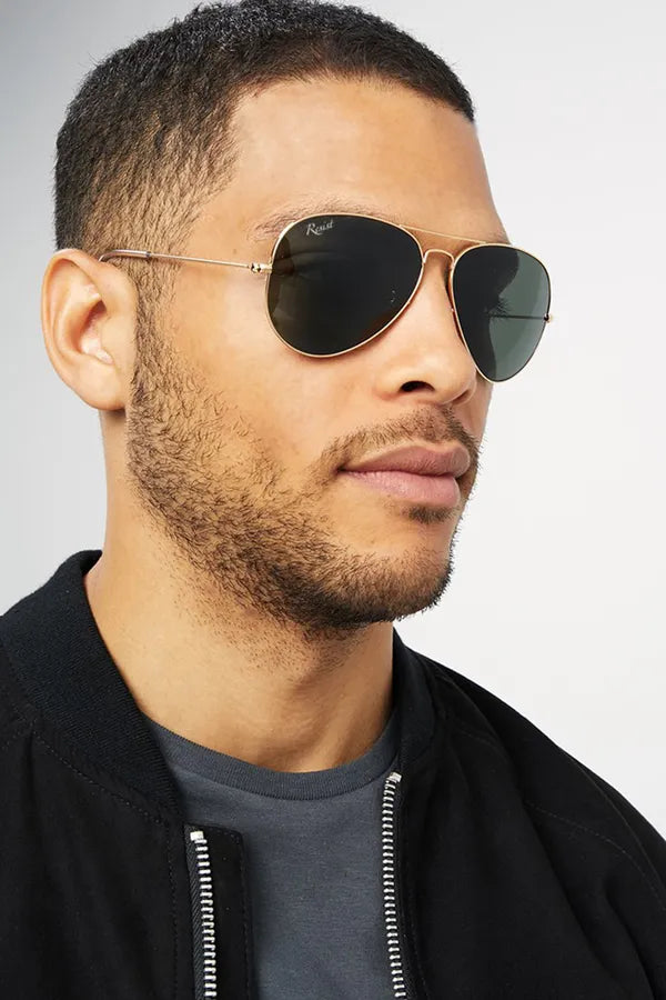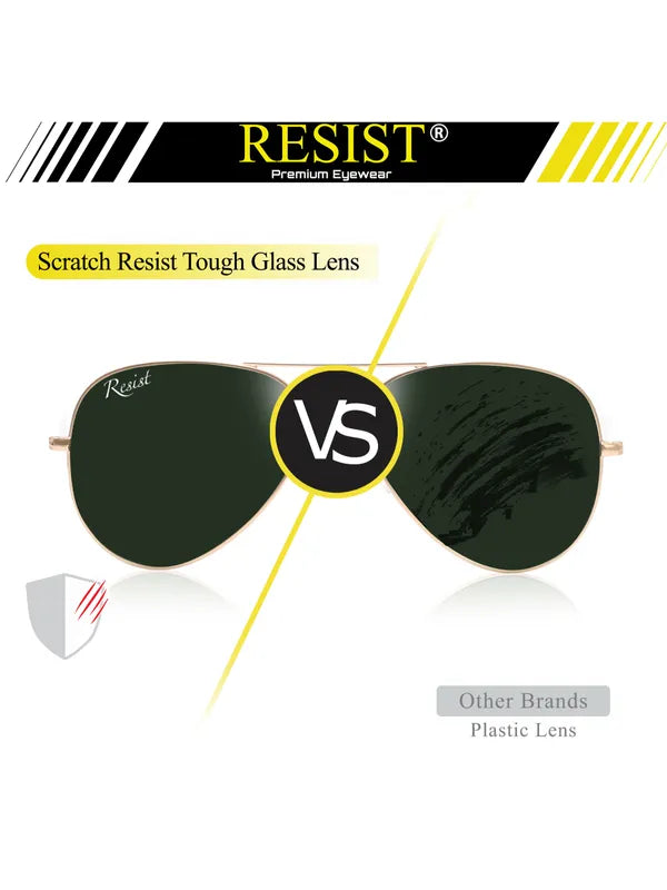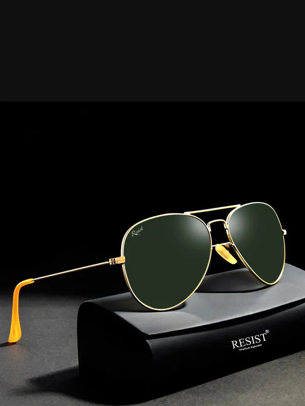Elevate your style with Resist Eyewear's UV-Protected Gold Green Aviator Sunglasses, designed for both men and women who value quality and sophistication. These aviators feature scratch-resistant glass lenses that deliver crystal-clear vision and easy cleaning, thanks to a multi-layer anti-reflective coating. The classic gold frame paired with green lenses reduces glare, offering a high-definition view with complete UV protection against harmful UVA and UVB rays. Ideal for outdoor activities like hiking, boating, and fishing or simply adding a touch of elegance to any outfit, these sunglasses blend functionality with timeless style.