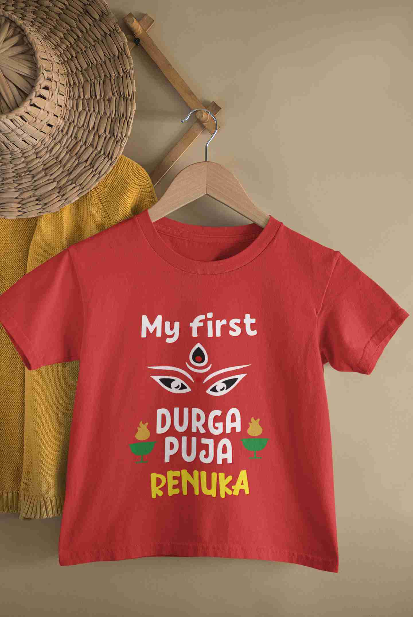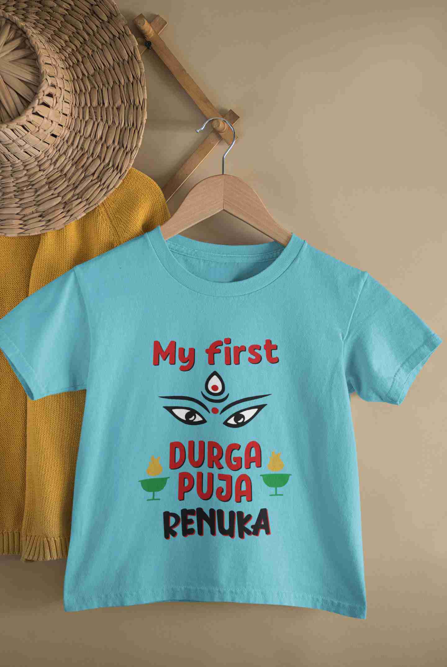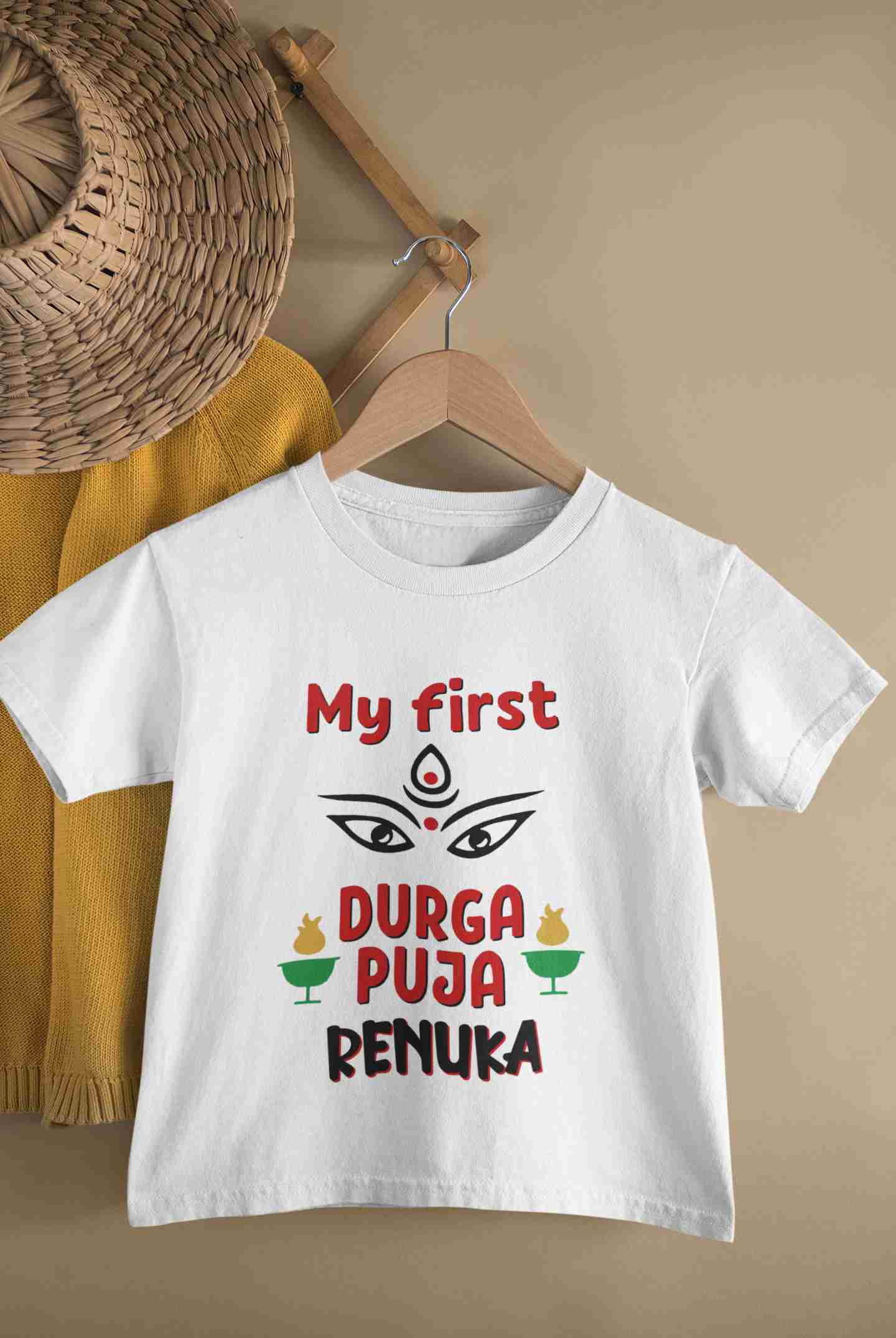 Custom Name My First Durga Pooja Half Sleeves T-Shirt For Girls -FashionRazor