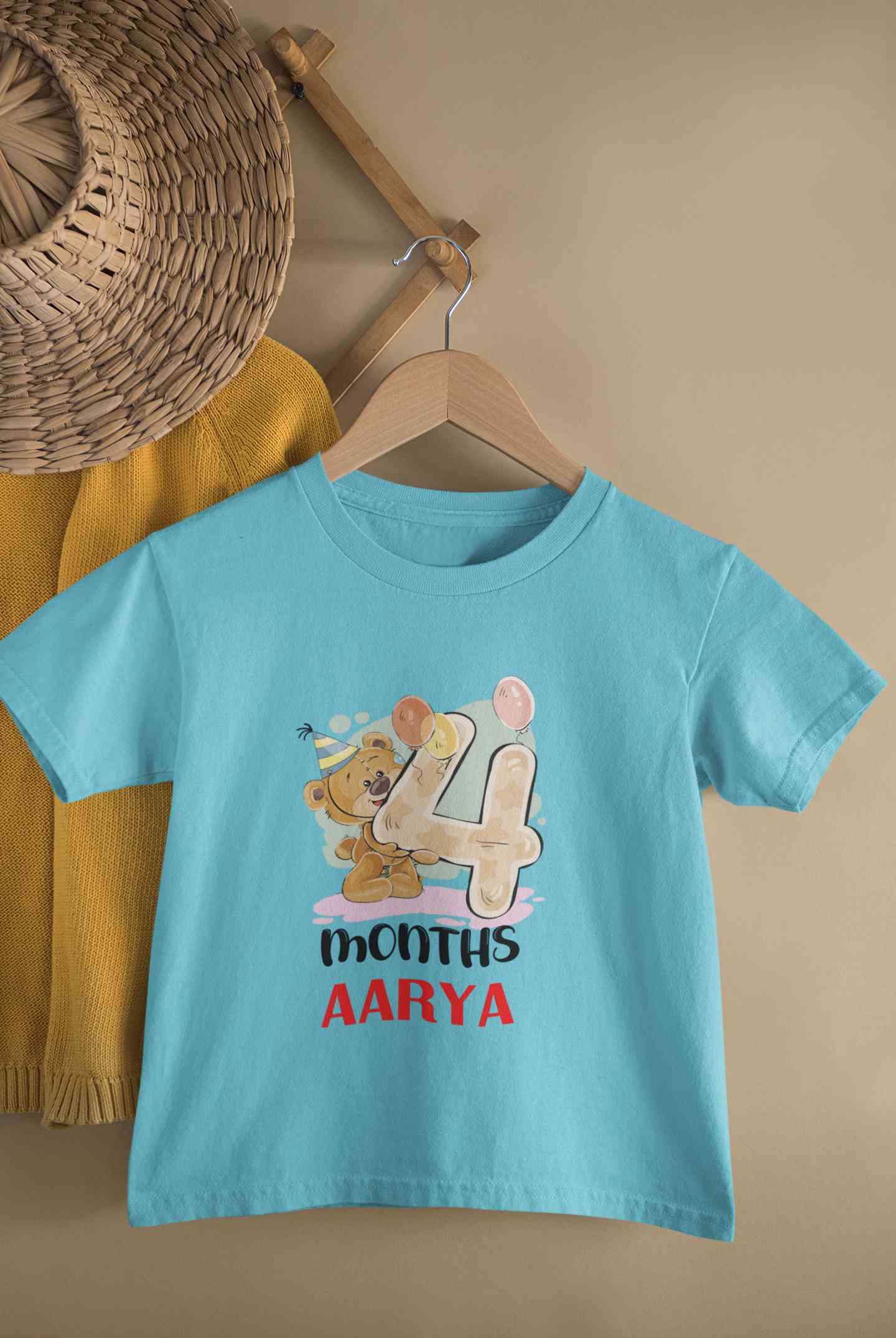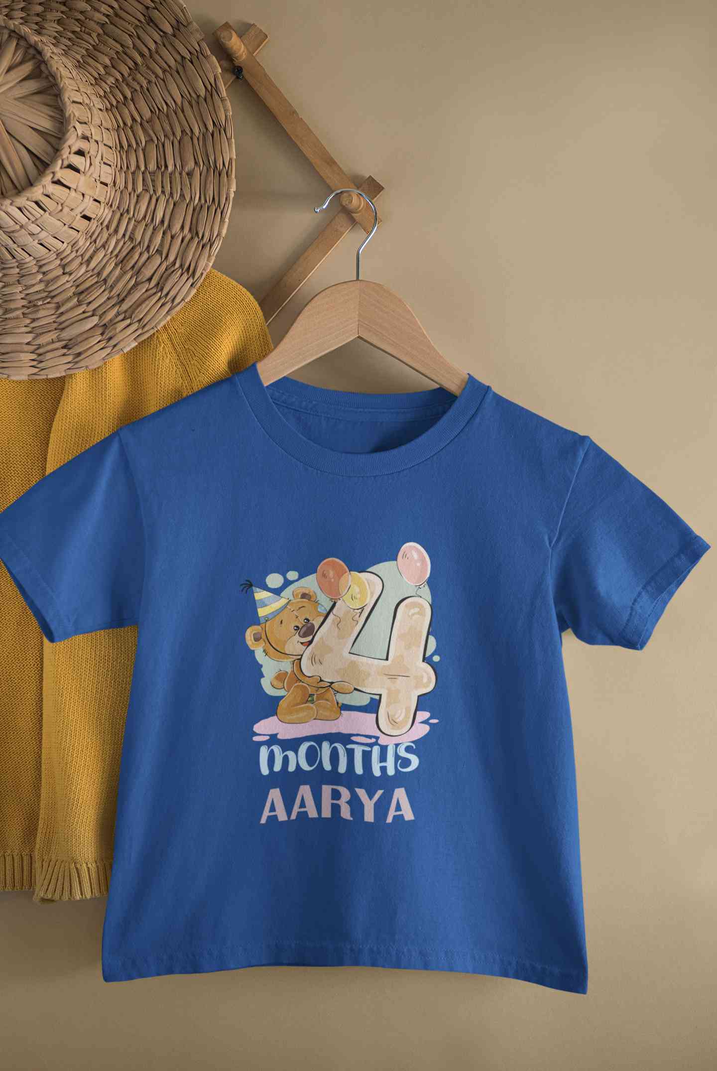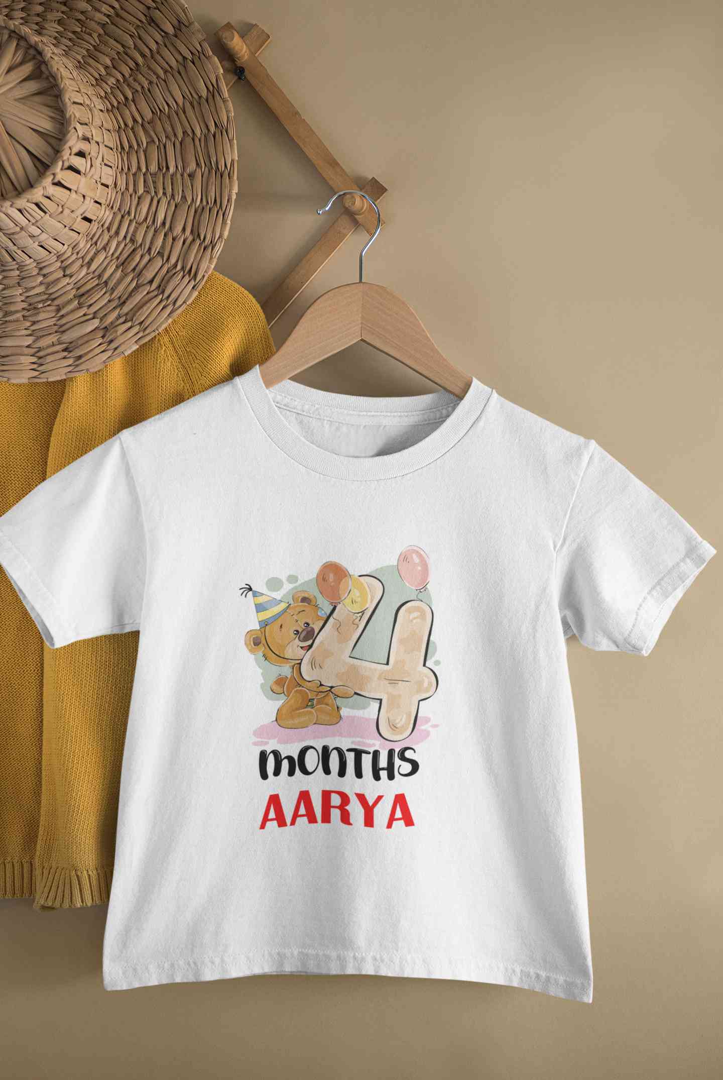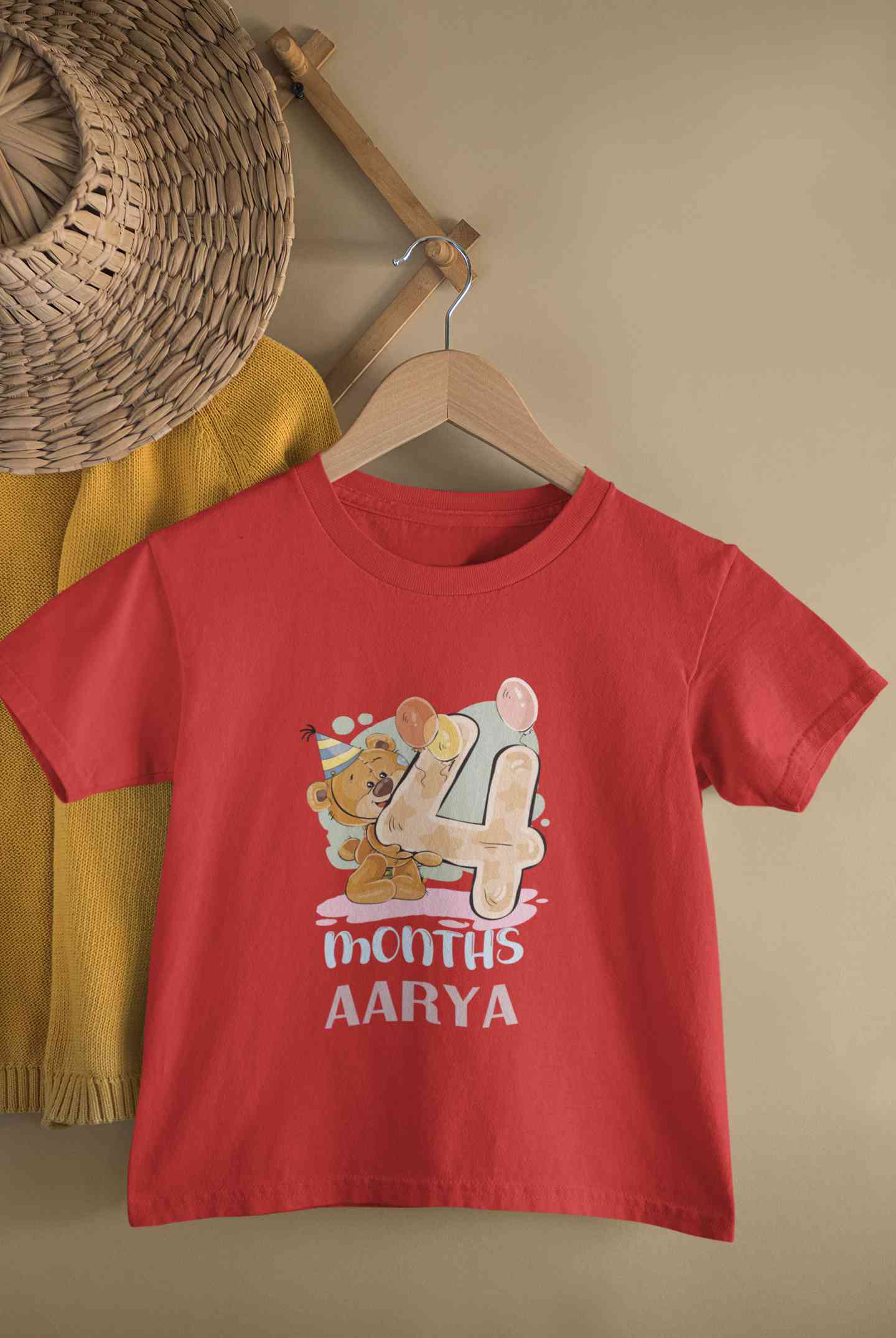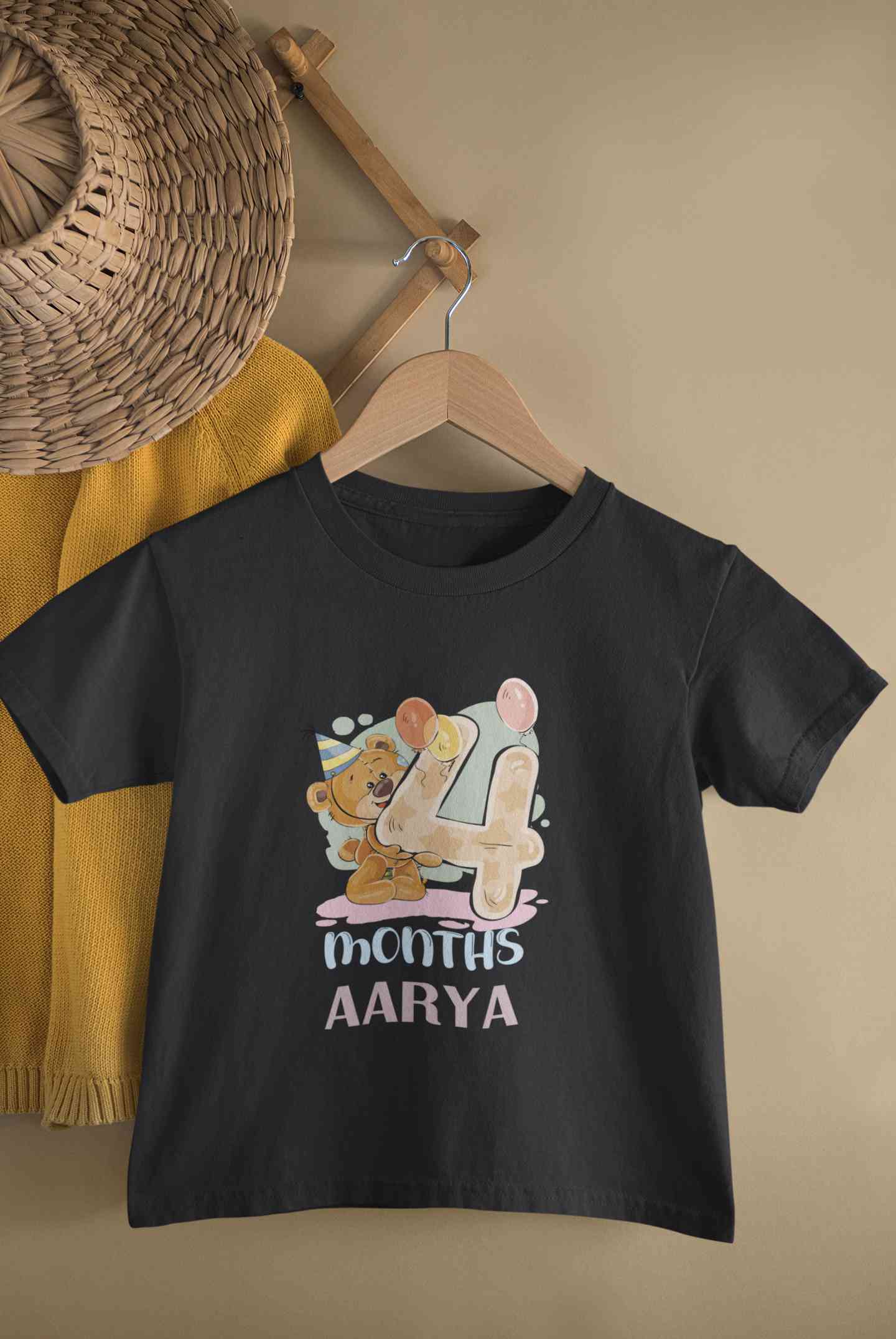 Custom Name 4 Month Birthday Teddy Design Half Sleeves T-Shirt For Girls -FashionRazor
