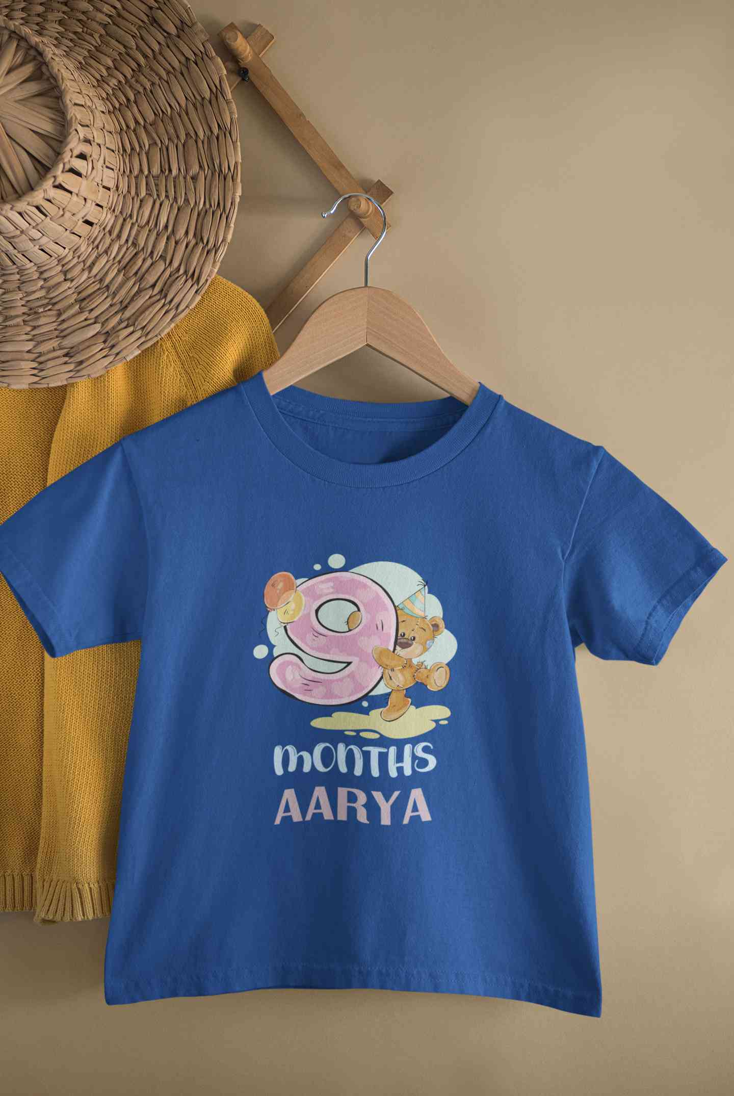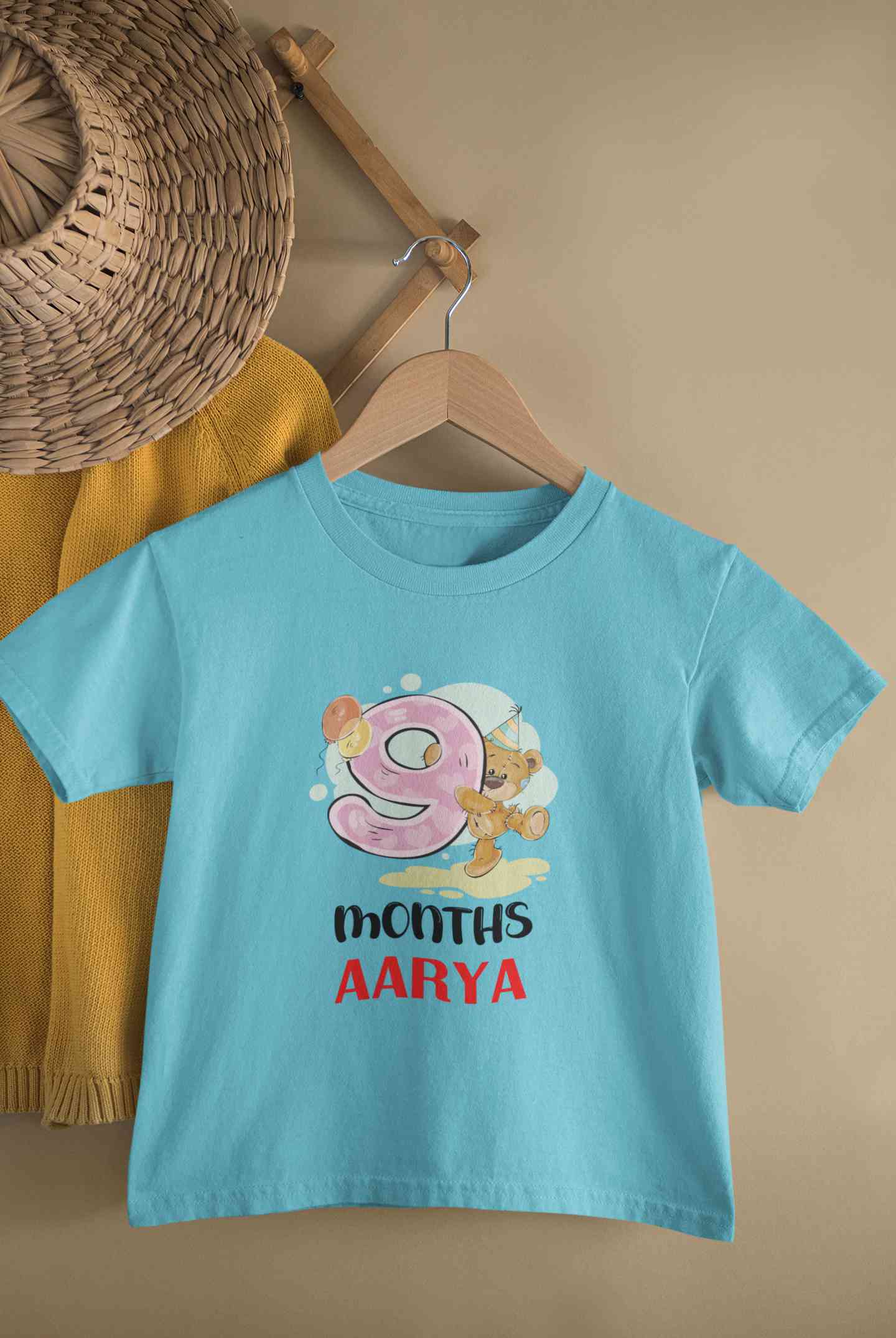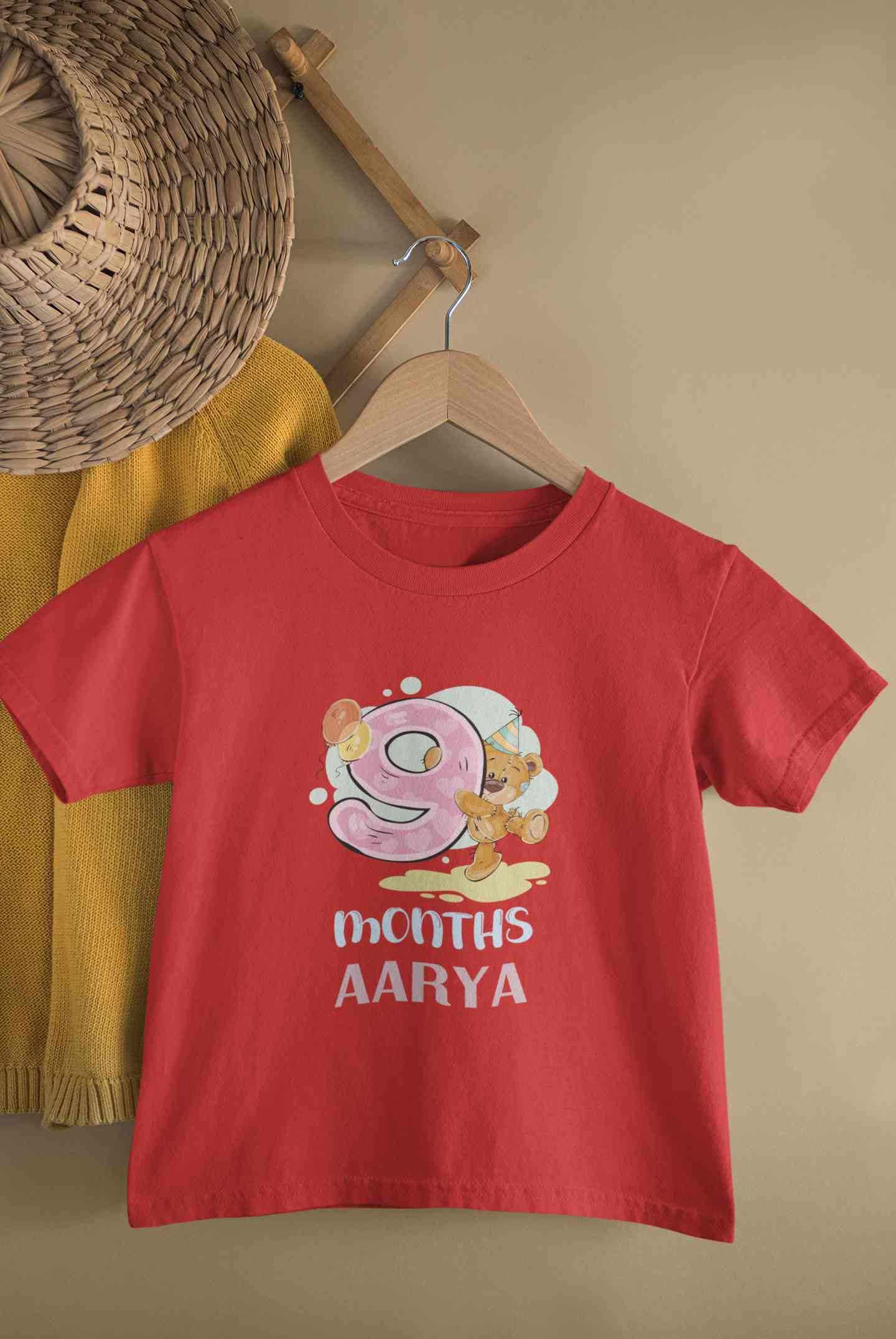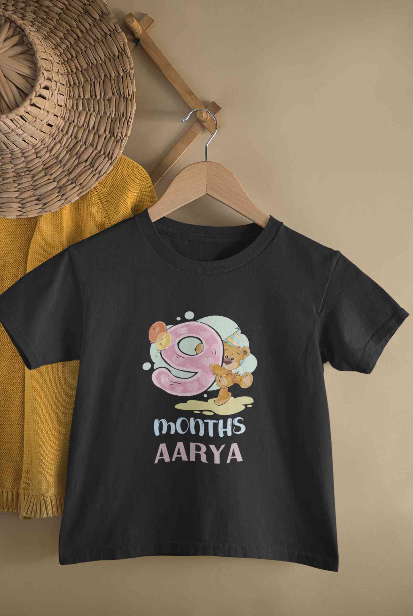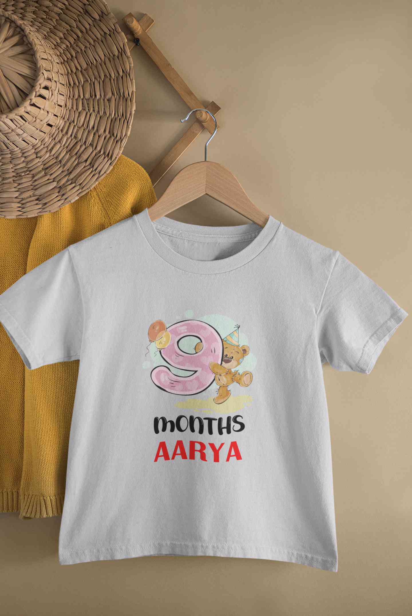 Custom Name 9 Month Birthday Teddy Design Half Sleeves T-Shirt For Girls -FashionRazor