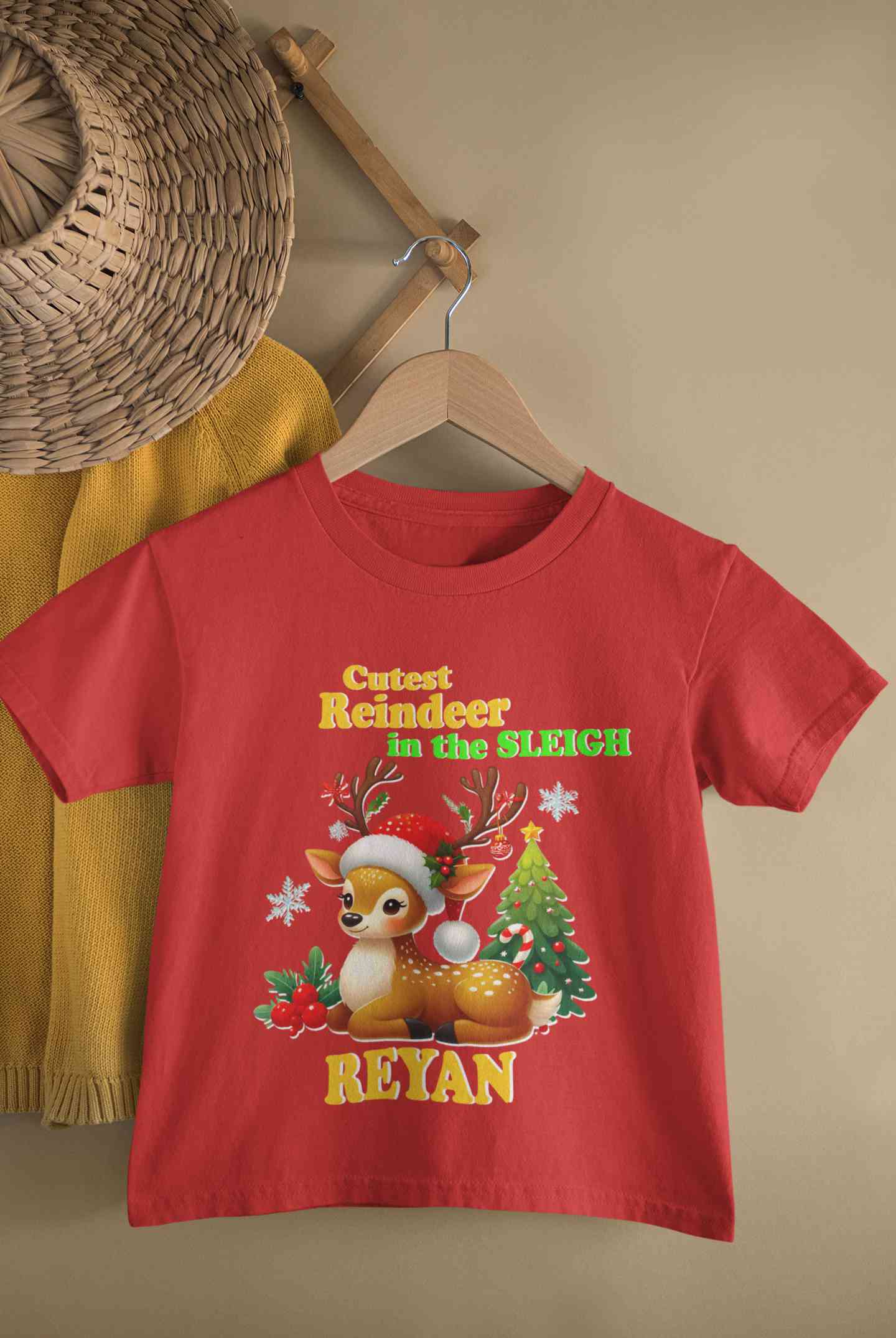 Custom Name Cutest Reindeer In The Sleigh Christmas Half Sleeves T-Shirt for Boy-FashionRazor