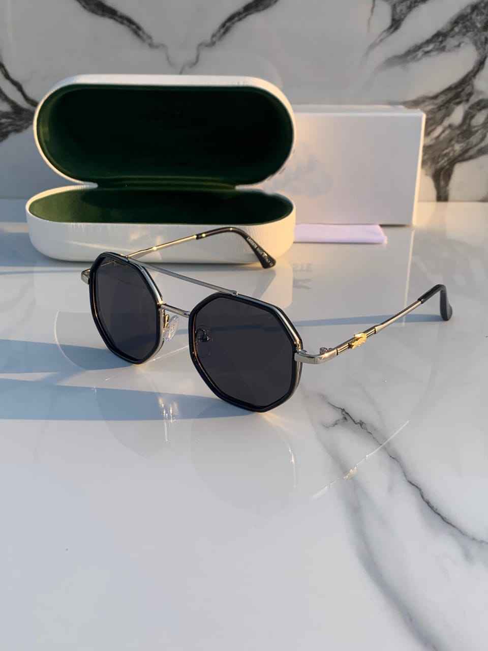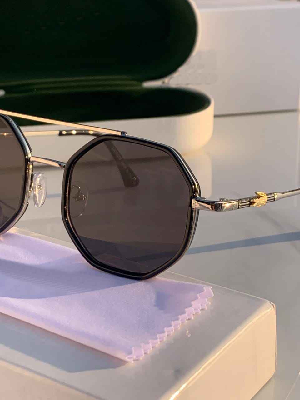Embrace a sleek and sophisticated look with these luxury octagon sunglasses. The distinctive geometric shape is paired with a polished black frame and elegant gold accents, offering a blend of bold style and timeless elegance. Designed to make a statement, these sunglasses provide full UV protection while enhancing your fashion game. The lightweight frame ensures comfort, while the durable construction guarantees long-lasting wear. Whether you're channeling a celebrity look or adding an extra edge to your wardrobe, these sunglasses are perfect for any occasion.