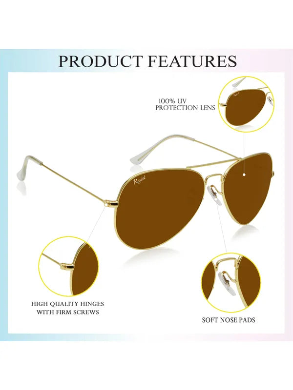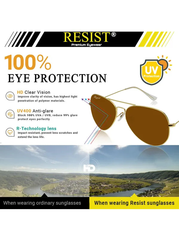 Elevate your look with the timeless appeal of the UV-Protected Gold Brown Aviator Sunglasses by Resist Eyewear. Crafted with high-quality glass lenses, these aviators provide superior clarity, scratch resistance, and easy maintenance. The multi-layer anti-reflective coating enhances vision by reducing glare, while the sturdy gold metal frame ensures a comfortable and stable fit for all-day wear. These versatile sunglasses, designed for both men and women, offer 100% protection against harmful UVA and UVB rays, making them perfect for both formal occasions and adventurous outdoor activities like hiking, fishing, and boating. Enjoy style, comfort, and peace of mind in any environment.